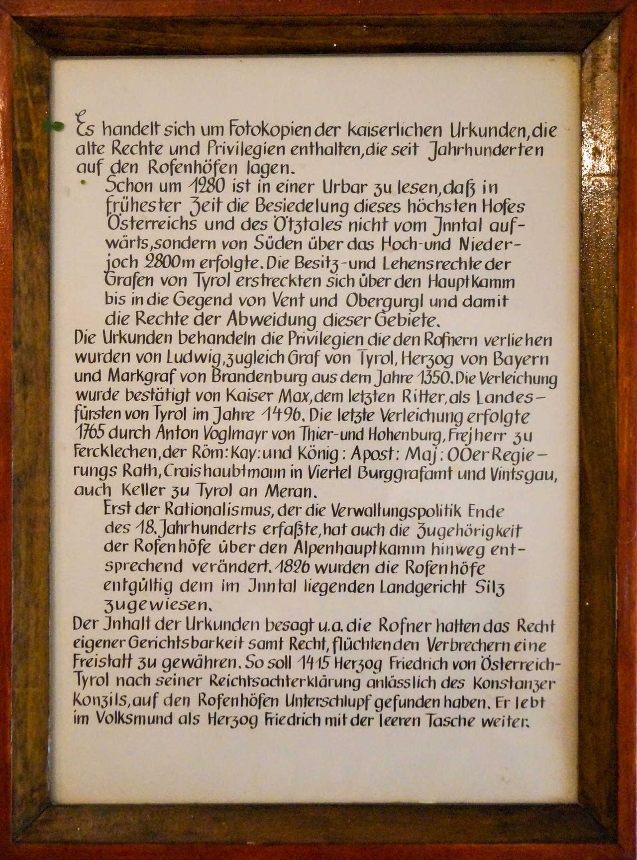 Die Rofenhöfe, Sie sind die höchstgelegenen, ganzjährig bewirtschafteten Höfe Österreichs (2014 m Seehöhe). Erste Ansiedlungen von Schafhirten wurden im 13ten Jahrhundert errichtet. Auf Grund ihrer Lage wurden den Rofenhöfen bis zum 19ten Jahrhundert besondere Rechte, wie Fischerei, Jagd, Asylrechte, Bergfrieden und Steuerfreiheit eingeräumt. Auch Friedl mit der leeren Tasche versteckte sich auf seiner Flucht in den Rofenhöfen. Ein berühmter Vorfahre der heutigen Bewohner war Leander Klotz, er war der Erstbesteiger der Wildspitze.